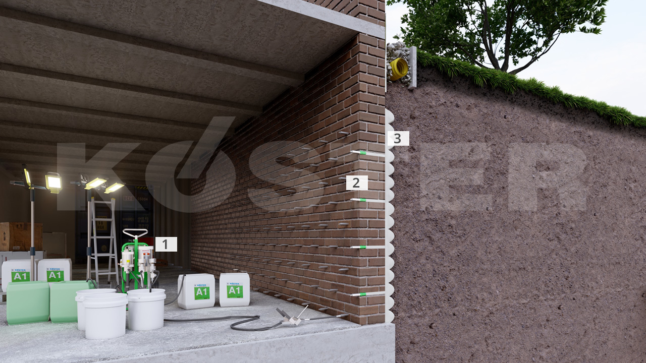 V prípade opráv suterénu, môže byť hydroizolácia realizovaná aj z vnútra, bez potreby vykonania výkopových prác okolo budovy. To v praxi znamená, že je možné vykonať permanentné zaizolovanie stavby bez potreby vykonania akýchkoľvek zemných prác. Takýto druh izolácie je možné realizovať systémami KÖSTER, aj keď má stena aktívne netesnosti. Následne, po úspešnej realizácii hydroizolácie, je nanášaná difúzne otvorená sanačná omietka.