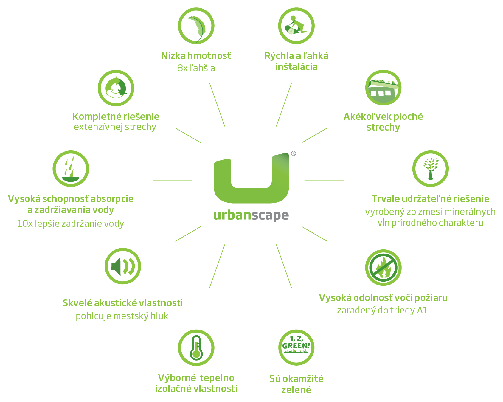 Je to inovatívny, ľahký systém s vysokou kapacitou zadržiavania vody, navrhnutý najmä pre jednoduchú aplikáciu pre ploché strechy bytových domov a nebytových budov. URBANSCAPE možno realizovať na všetkých typoch strešných konštrukcií plochých striech – na betónových alebo oceľových nosných plochách, na konštrukcii obrátenej strechy, či na všetkých strešných povrchoch.