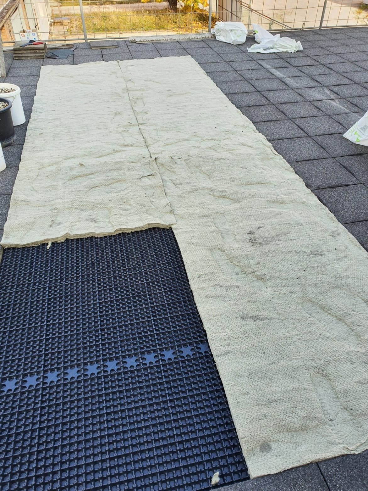 Na odvodňovacie panely alebo baly Urbanscape rozprestrite substrát Urbanscape Green Roll tak, aby jeho okraje k sebe priliehali čo najtesnejšie.